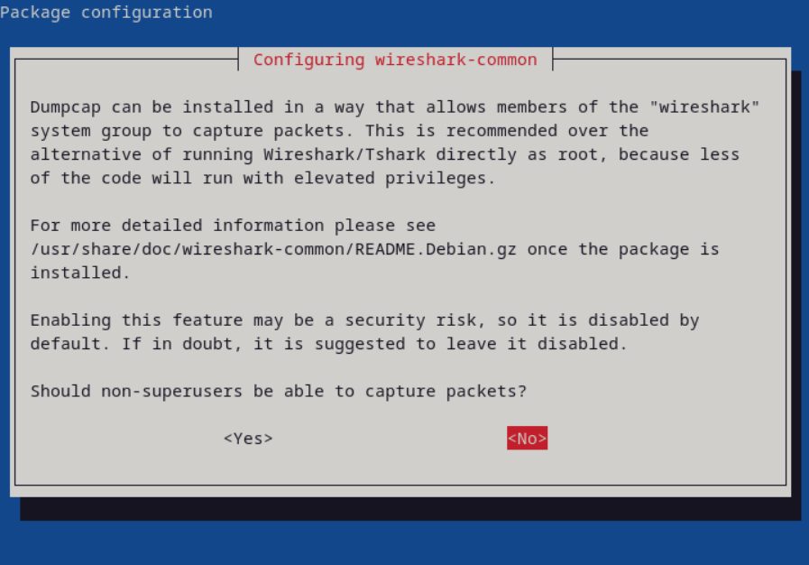 Что это значит: Если вы выберете «Yes», то в системе будет создана группа wireshark, а программа dumpcap (которая отвечает за захват пакетов) получит специальные права (Linux capabilities). Пользователи из группы wireshark смогут захватывать пакеты без прав root.